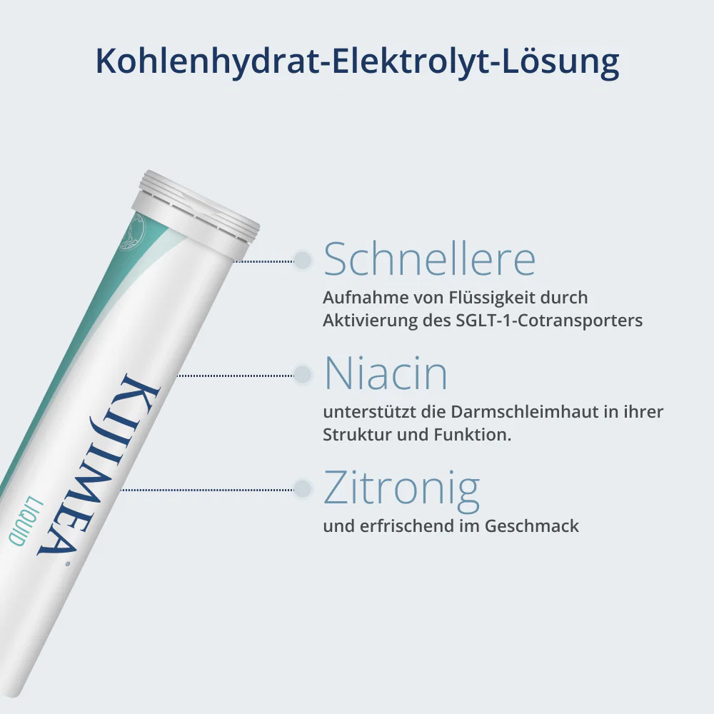 Kijimea® Liquid enthält einen einzigartigen Nährstoffkomplex aus Elektrolyten und Mikronährstoffen: Die spezifische Zusammensetzung ermöglicht es dem Körper, deutlich mehr Flüssigkeit deutlich schneller aufzunehmen.